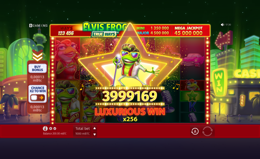 BGAMING's new slot - Elvis Frog TRUEWAY - is another slot for Elvis Frog. The protagonist returns to Las Vegas with his glamour, joie de vivre and party atmosphere. The new slot uses the TRUEWAYS mechanic with 262,144 ways to win and a new Lightning Feature. The slot has one of the largest number of features - in addition to Scatter Symbols, Free Spins, Substitution Symbols and Substitution Symbols with Multipliers, there is also a Coin Revolve feature with the chance to win three types of Jackpots.