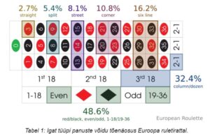 В отличие от этого, на колесе Европейской Рулетки есть только один зеленый слот, обозначенный "0", и, таким образом, сумма всех чисел на колесе составляет 37. Хотя это может показаться малозаметным различием, его последствия сказываются на игре в целом, существенно влияя на возможности и вероятности игры (см. табл. 1).
