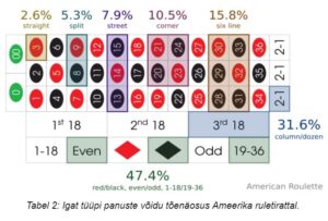 Таблица 2: Вероятность выигрыша для всех типов ставок на колесе Американской Рулетки.